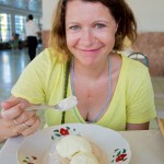 In the town of Cienfuegos, we stopped at the national ice cream chain called Coppelia. Coppelia is famous for its lines, because this is the place where Cubans come to get their ice cream. We waited for 15 minutes until we were seated and then another 15 before our order was taken (shorter than average, perhaps because we were in Cienfuegos, not Havana). There were 2 flavors that day and we chose one of each. While we waited, I couldn’t help but observe the atmosphere in the place, which was very somber and serious. Each Cuban ordered around 6 scoops, which cost about 80 cents (US). When the ice cream arrived, in Chinese porcelain soup bowls, everyone began eating noislessy. Stranger still, was that people began scooping leftover ice cream into empty plastic containers to eat later at home (melted or perhaps refrozen).
